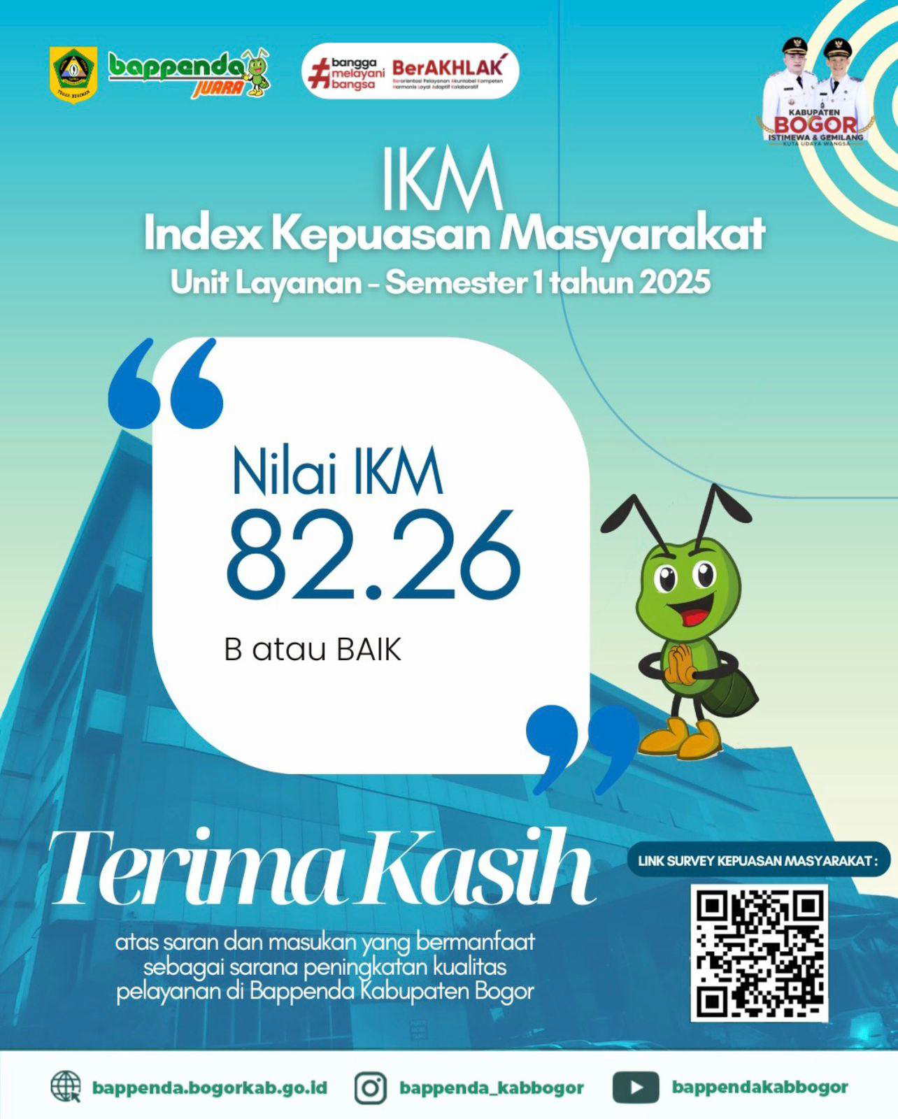 Bappenda Kabupaten Bogor mengucapkan terima kasih sebesar-besarnya atas saran dan masukan yang telah diberikan selama ini. Komitmen pelayanan yang berakar pada nilai AKHLAK dan semangat inovasi akan terus dijaga, agar seluruh masyarakat benar-benar merasakan manfaat pelayanan yang cepat, akurat, dan ramah.